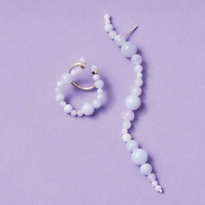展示会で出合ったウィーンを拠点とするアクセサリーブランド。ブルーにミルクを溶かしたようなカルセドニーに惹かれ、ピアスとイヤカフを購入。キャンディーのような質感は、見るたびにキュンとします。