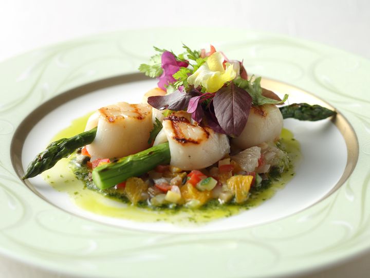 【総料理長・毛塚シェフ監修】帆立貝の網焼き 彩夏野菜と柑橘のマリアージュ
