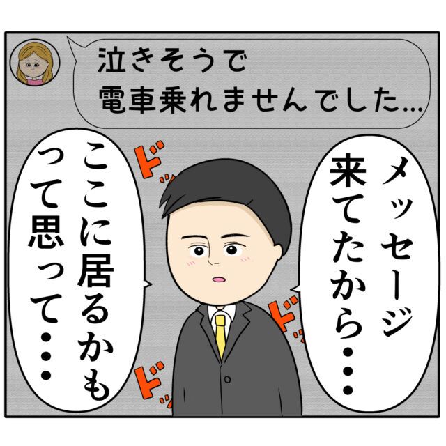 電車に乗ってすぐ、ふり子さんからの「奥さんがいる人を好きになってしまって苦しい」というメッセージを受け取った良し男さんは、思わず電車を降りて改札口に戻ります。そこにはふり子さんが立っていて・・・。