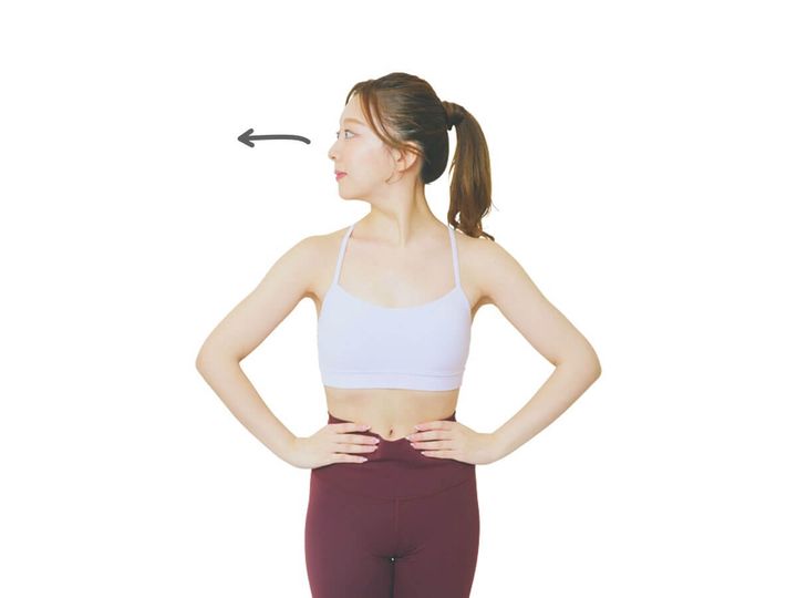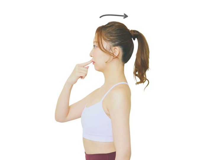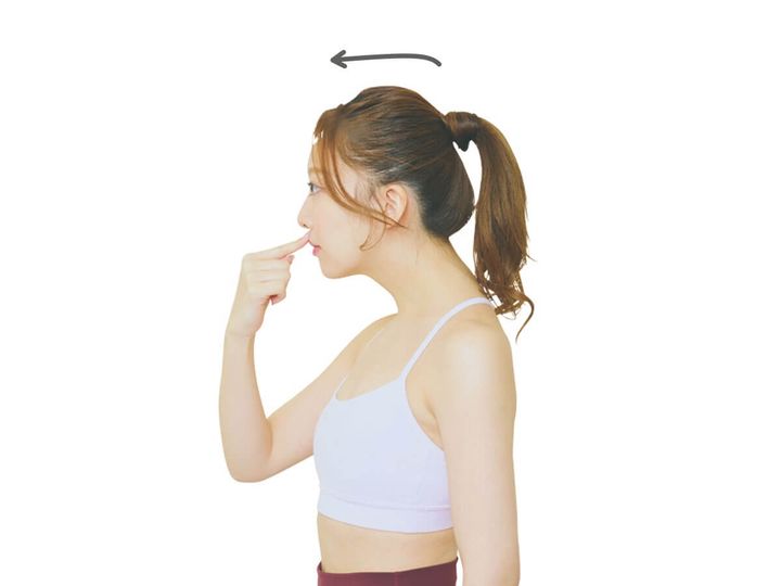 指を押しながら耳の位置が肩の上にくるように頭を後ろに移動させる。この動きを繰り返してアゴを正しい位置に収めることで、姿勢を整えて。