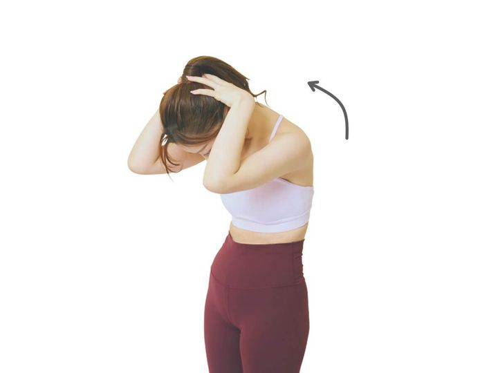 頭と首の境目のくぼみに親指を添えて他の指で頭全体を支えたら、吸う息に合わせ体を反らす。首の前側と背骨の縦の伸びを意識して。