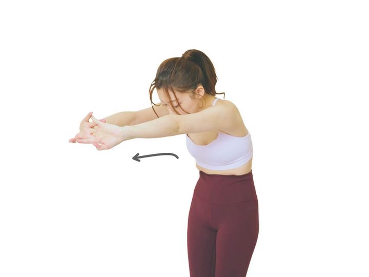 手はどちらが上になっ てもOK。胸元から手のひらを前側に向けて前に押し出す。その際しっかり背中を丸めて肩甲骨を開いていく。