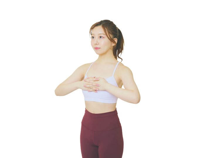吐く息で肩甲骨を大きく開いた2の状態になったら、吸う息で手のひらをまた胸に近づけ天井を見上げグッと胸を開く基本姿勢に戻る。