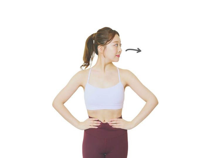 軽く腰に手を添えて、顔を横に振る。背筋は縦に伸ばすようなイメージで、胸の前も開いた状態で動かしていくのがポイント!