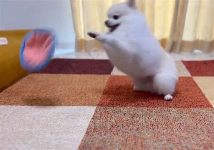 空中キャッチに失敗してしまったポメラニアン。 しかし、まるで成功したかのようにご機嫌な表情を見せていました!!