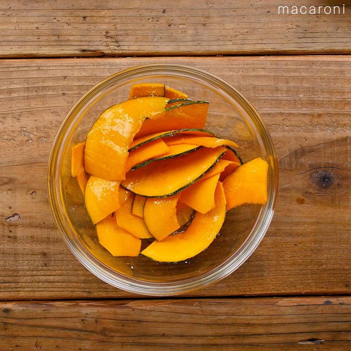 3: スライスしたかぼちゃにサラダ油と砂糖を加え、全体に油と砂糖が馴染むよう混ぜ合わせます。