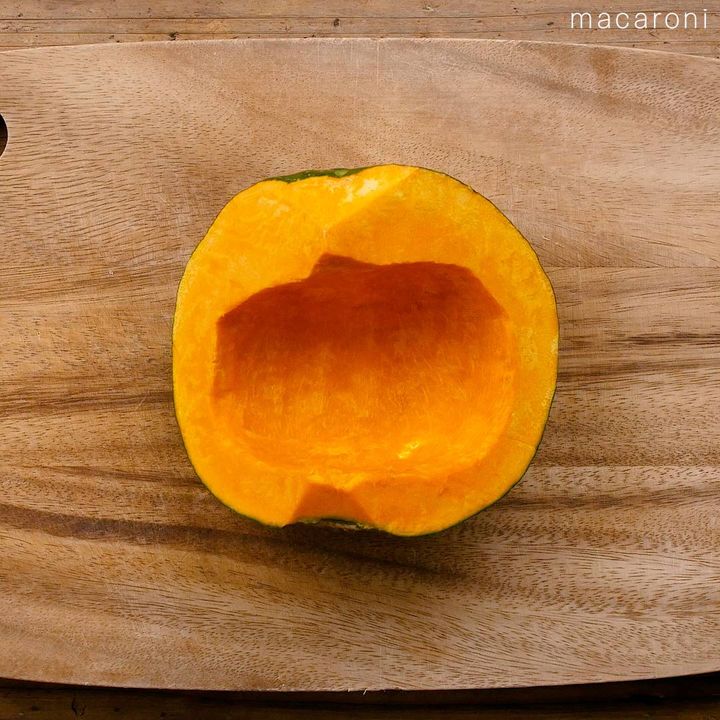 1: かぼちゃはワタとタネを取り除き、スプーンで中の繊維をかき出します。