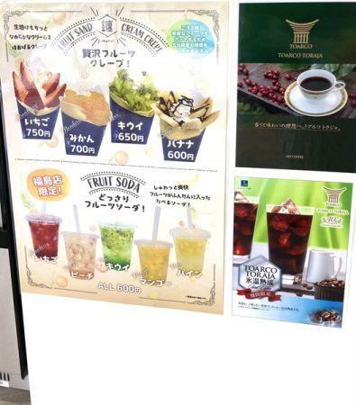 完全お持ち帰りだけかと思いきや、ドリンクやクレープも販売しています。いちご、ピーチ、キウイ、マンゴー、パインなどが入っているフルーツソーダはこれからの暑い時期にもぴったりですね。