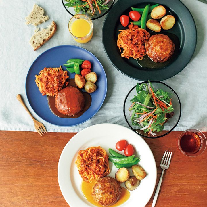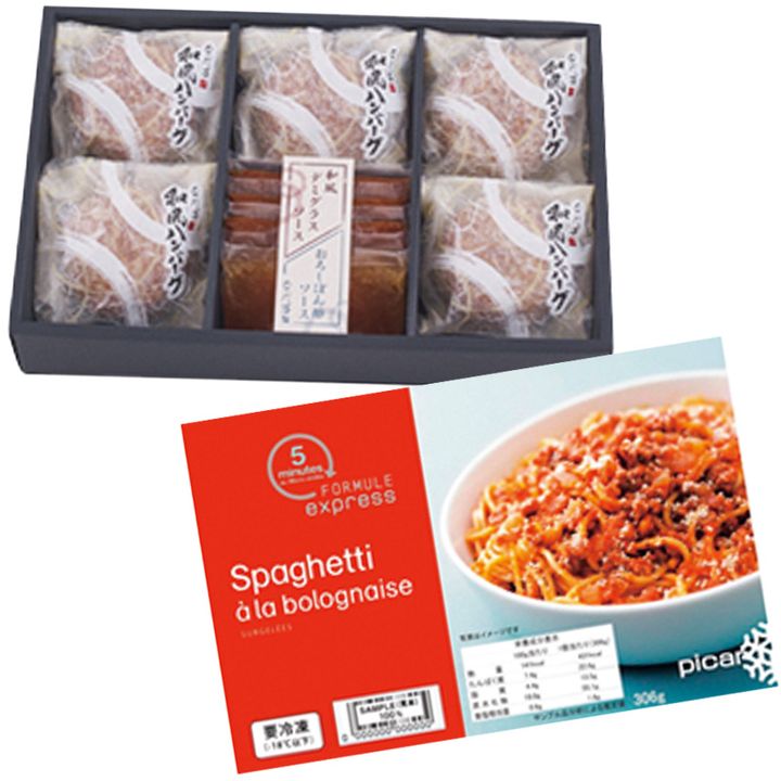 〈上〉かつおと昆布の旨みがぎっしり詰まった、老舗「なだ万」のハンバーグ。 2種類のソース付き。和風ハンバーグ5個¥5,400(なだ万) 〈下〉牛肉と豚肉の合挽き肉が贅沢に使われたボロネーゼ。冷凍食品の概念を覆す、上質なパスタにファン多数。 スパゲッティ ボロネーゼ¥849(ピカール)