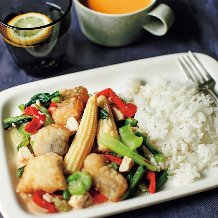 カラッと揚げた鱈のフリットと甘みのある野菜に、ナンプラーの深い旨みが合わさったタイ風香味蒸し。 レモングラスの爽やかな香りにも食欲がそそられる!ヤングコーンと鱈のレモングラス香るタイ風香味蒸し[初回特別M BOX]¥842(GREEN SPOON)