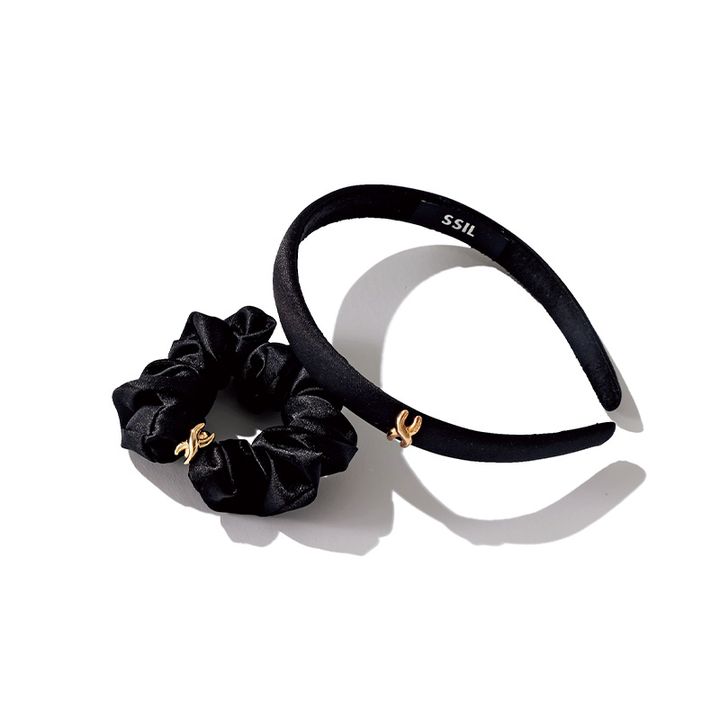 モードでシックなブランドのシンボルのXモチーフ。韓国ドラマでの着用率も高くアイドルやインフルエンサーの間でも人気。カチューシャ¥13,200(SSIL/オデット エ オディール 新宿店)ニット¥25,300(ラッピンノット/ウメダニット)シュシュ¥12,100(SSIL/オデット エ オディール 新宿店)