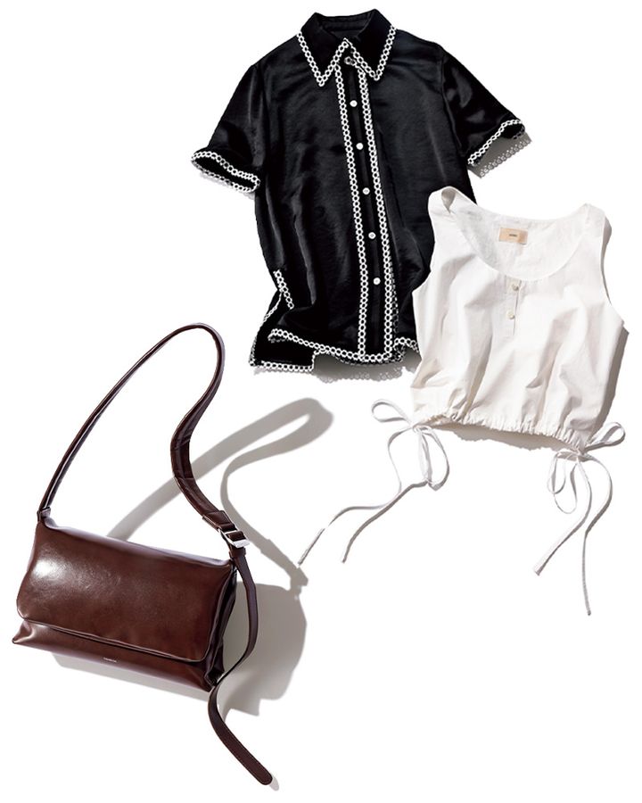 “いつもの”になりがちなロンTとタンクトップが、レイヤードするだけで洒落るなんて、この一技に韓国味が。伸縮性のあるふわもち生地で着心地も抜群、単品使いも可能なお得感もあり。 レイヤードトップス¥12,980〈ル〉トートバッグ¥3,850〈オーエフアール〉(ともにスローブイエナ 自由が丘店)ハンドバッグ¥62,700(ロウ クラシック/アダム エ ロペ)パンツ¥15,400(リーバイス/ジャーナルスタンダード 自由が丘店)イヤリング¥9,450(アビステ)リング[人差し指]¥138,600リング[中指]¥561,000(ともにマリハ)バングル¥42,900(モニス/フォーティーン ショールーム)サンダル¥70,400(ネブローニ)