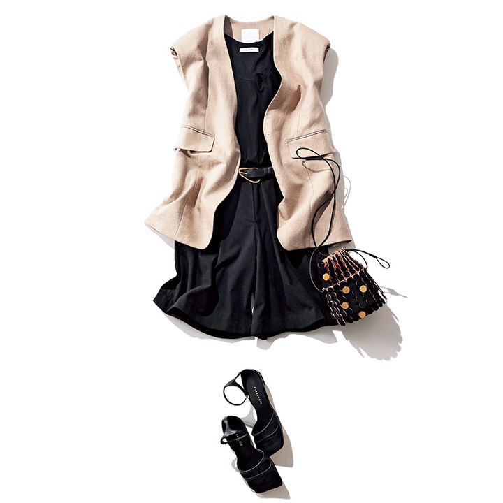 こんな大人なスタイリングが叶うアイテムも発見。ショートパンツは、短すぎず長すぎずな大人丈で野暮ったくならない、絶妙なシルエット。 ショートパンツ¥16,940(ル/スローブ イエナ 自由が丘店)ジレ¥24,200(エレンディーク)タンクトップ¥11,000(チノ/モールド)ベルト¥27,500(ニアー ニッポン/ニアー)バッグ¥37,400(メアリー オル ターナ/アダム エ ロペ)サンダル¥37,400(ピッピシック/ベイジュ)