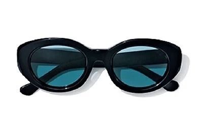 サングラス /アヤメ レトロな太フレームと透けるブルーレンズの組み合わせ。シンプルなコーディネートにさりげない遊びが出て、顔回りも引き締まって見える配色。