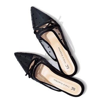 ミュール(2) /ファビオ ルスコーニ(ファビオ ルスコーニ ルミネ有楽町店) リボン・ドット・シースルー。甘さを印象づけるディティールも大人っぽい仕上がり。甲は浅めで肌感の出るミュールなら、ヒールじゃなくても脚を短く見せない。