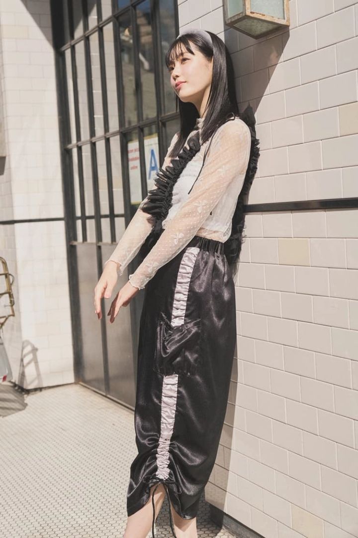 サテン素材や透け感などしゃれ見え要素満載のコーデ。バッグをコーデのアクセントに!