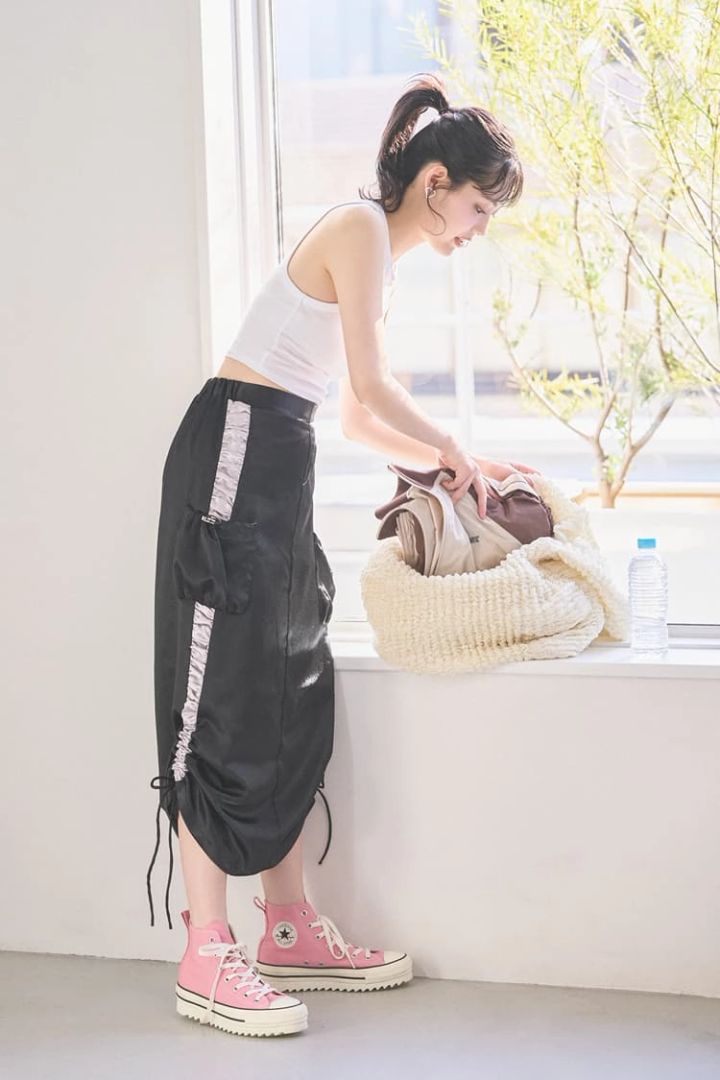 タンクトップにカーゴスカートをあわせて、バランスのとれた肌見せに!ピンクのスニーカーを差し色にして♡