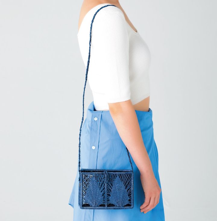 バリの伝統的な技術を取り入れたバッグは、緻密な編み目が美しい。バッグ W27×H32×マチ7cm¥15,400(バリ・ワークスタット/ショールーム ロイト) ブレスレット¥63,800(サピア バハール/フィルグショールーム)