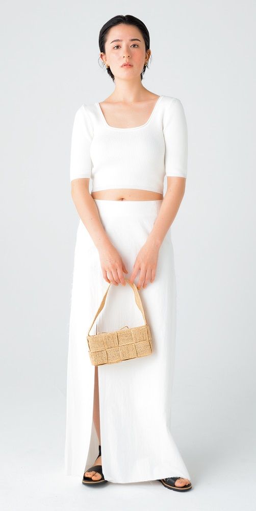 小脇に収まるコンパクトなフォルムが都会的。カギ編みで仕上げた優しい風合いも持ち味。バッグ W20×H10×マチ5cm¥30,800(ソフィーディガール/ビショップ TEL:03・5775・3266) トップス¥28,600(pan/サンカッケー) ロングスカート¥36,300(ケイル) ピアス¥45,100(サピア バハール/フィルグショールーム TEL:03・5357・8771) サンダル¥14,300(ソレル/コロンビアスポーツウェアジャパン TEL:0120・193・803)