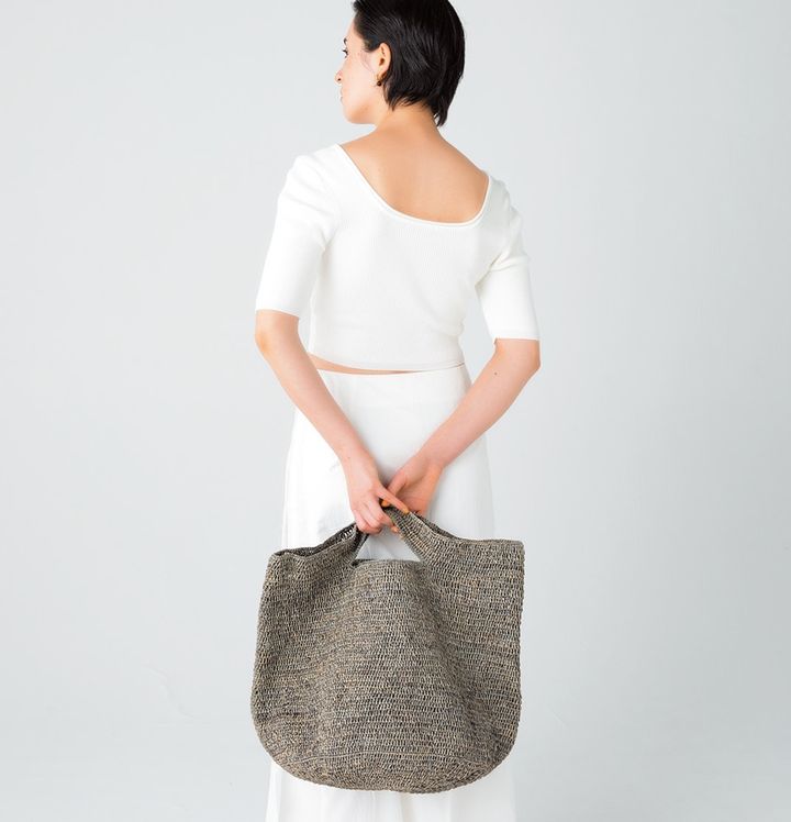 ラフィアの繊維で細やかに編まれたバッグは、ミニマルなシルエットで洗練された表情に。マチが広く収納力もばっちり。W50×H37×マチ37cm¥14,850(メイド イン マダ/ジャック・オブ・オール・トレーズ プレスルーム)