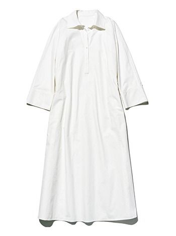 白裏毛ワンピース 36,300円/ebure(ebure GINZA SIX店) クリアな白が生きる、直線的なライン。スウェット風の落ち感のある質感が、一助となって色みゆえの緊張感をOFF。肩が隠れるそでもスタイルアップに貢献。
