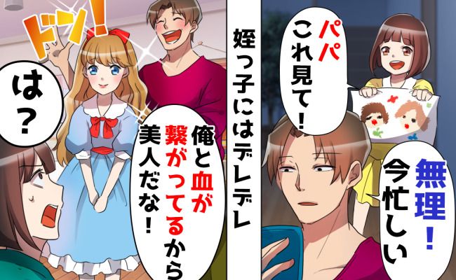 自分の娘には関心がないくせに「本当に美人さんだな~♡」と、姪ばかりかわいがる夫にイライラしてしまいます。そしてあるとき、夫と姪が話しているところに娘が入ろうとすると「お前はどこかに行ってろ!」と怒鳴る声が聞こえてきたのです!