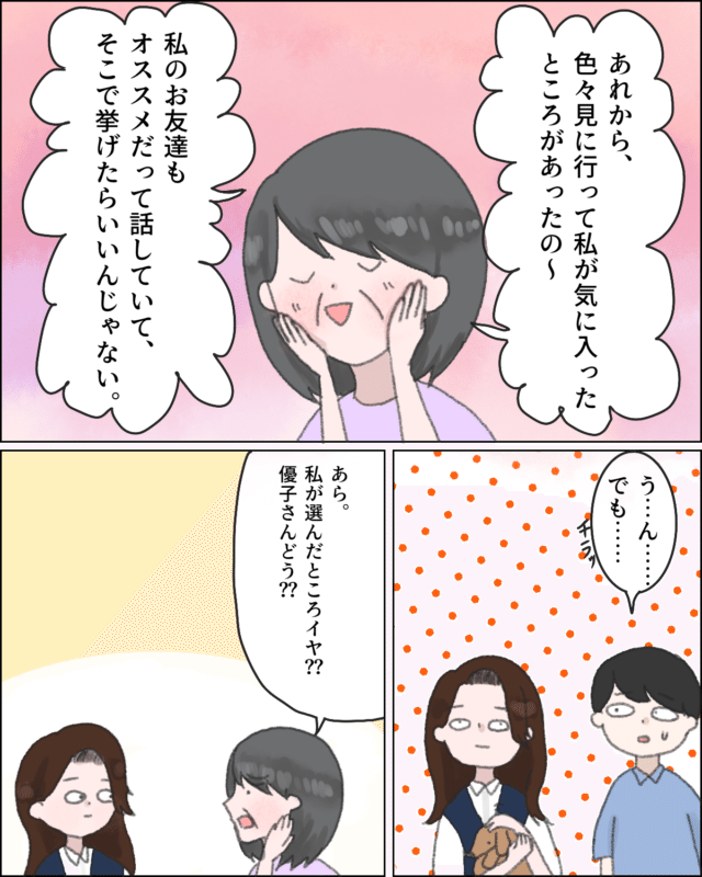 義母から届いた大量のブライダルフェアのパンフレット。自分たちで決めたい優子さんはため息をつきますが、ある作戦を思いついたようです。