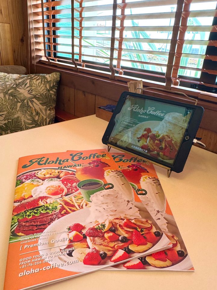 注文はタッチパネルで、人気のパンケーキや、ロコモコ、ハンバーガーなどハワイを代表するお料理が豊富にあります。