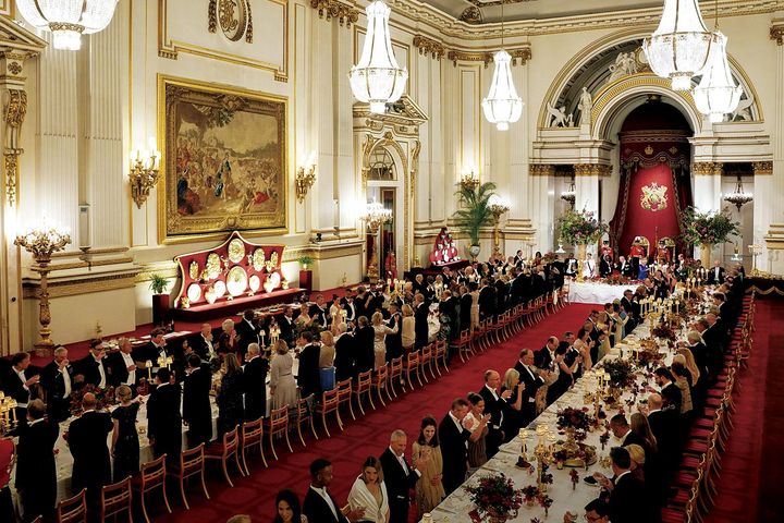 こちらは2022年にバッキンガム宮殿で催された国賓晩餐会の風景。英国王室の晩餐会はロングテーブルのしつらえが王道かつポピュラー。貴族やVI Pがずらりとテーブルに並ぶゴージャスなスタイルです。テーブル中央にはキャンドルや花々を施し、ゲストの目を楽しませます。