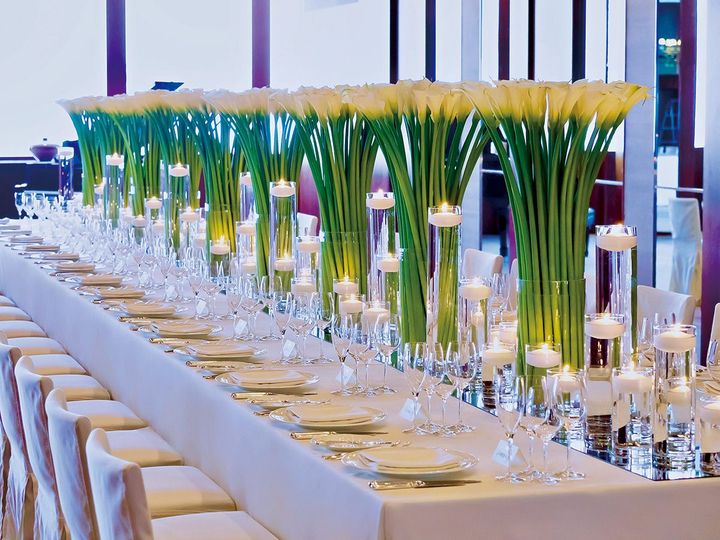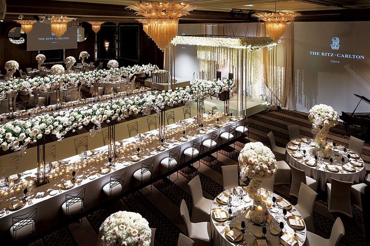 晩餐会スタイルはラグジュアリーホテルの得意とするところ。写真は「ザ・リッツ・カールトン東京」で行われたパーティの例。中央にロングテーブルをしつらえ、まわりにラウンドテーブルを配置しています。背の高い装花が素敵! ■お問い合わせ先/ザ・リッツ・カールトン東京 tel.03-6434-8781(ウエディングサロン)