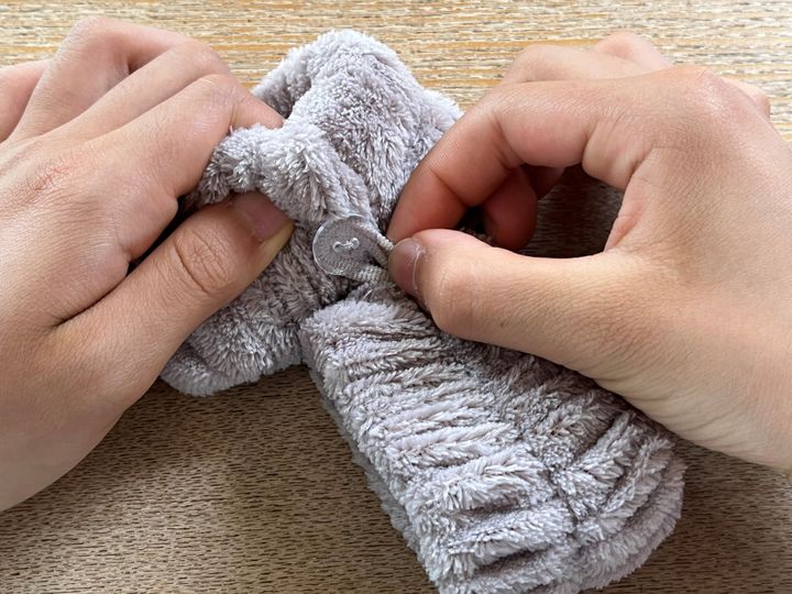 ぬいぐるみみたいなもふもふテクスチャーに、娘もひと目で気に入った様子。早速、翌朝の洗顔時に着けてもらいました。