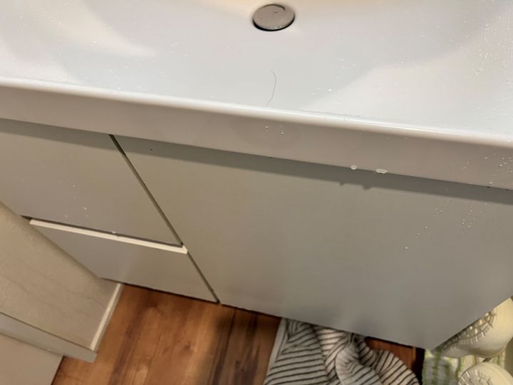 「洗顔時の袖濡れを防げる」とありますが、ココで水をキャッチしてくれるのなら、わが家の洗面所の床濡れも防げるに違いない!  と期待で胸が膨らみます。