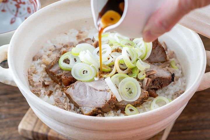 土鍋のご飯が炊けたら火を止めて蓋を外し、一口大に切ったチャーシューと長ねぎをのせる。再び蓋をして、10分ほど蒸らす。