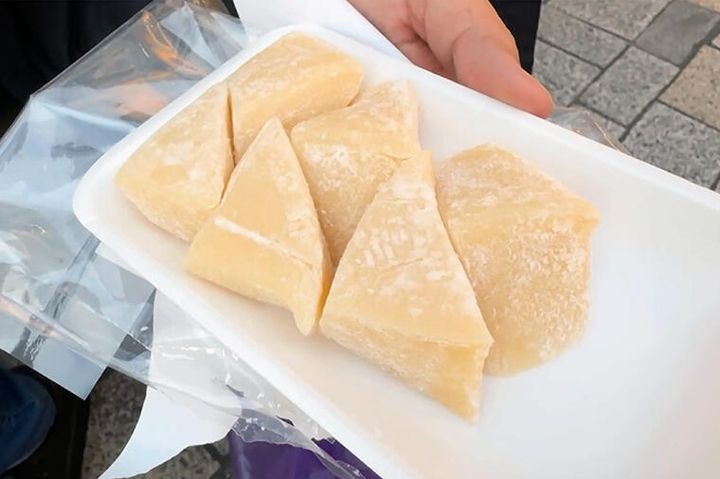 ほかにも、凍み大根やばっけ味噌(ふきのとうを刻んで味噌と合わせたもの。秋田ではふきのとうのことを「ばっけ」と呼びます)など、魅力的な食材がいろいろあったのですが、目に止まったのがバター飴。バターや砂糖などで甘味をつけた柔らかい餅で、時間が経っても硬くならないため、かつてはマタギが保存食として持ち歩いていたといいます。赤ちゃんのほっぺのようなふわりとした手触り、なめらかな食感とやさしい甘味がほっとするような味わいです。なつかしのミルキーのような、でも素朴な美味しさもあり、“ママの味”ではなく“母ちゃんの味”なのです。