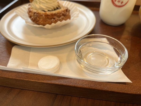 紙ナプキンにのった白いタブレットはおしぼりです。