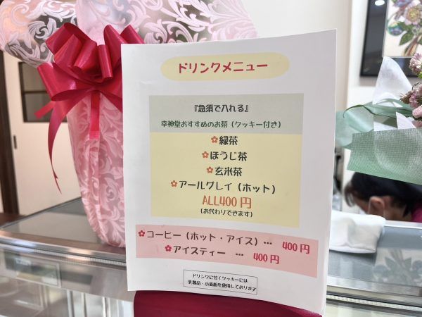 幸神堂さんのカフェスペースでいただけるドリンクは緑茶、ほうじ茶、玄米茶、アールグレイにコーヒーとアイスティーです。
