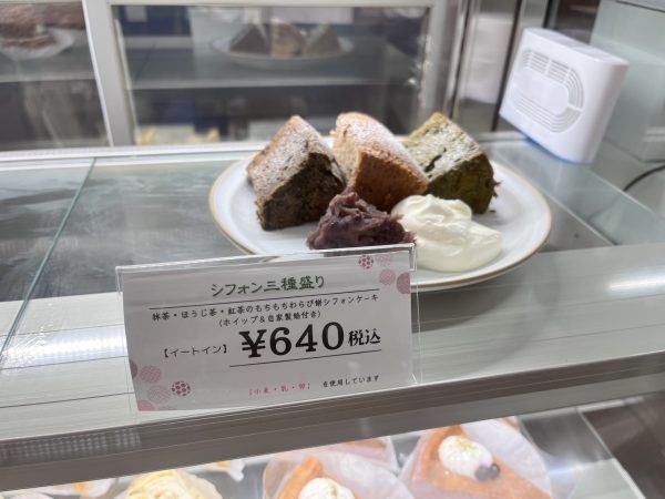 わらび餅粉のシフォンケーキはイートインであれば抹茶・ほうじ茶・紅茶味の3種盛り合わせで、ホイップクリームに幸神堂さんの美味しいあんこもついてきます!