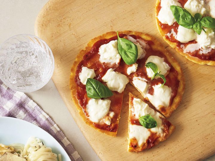 米粉やヨーグルトで作るピザは、軽い食べ心地が魅力。フライパンで蒸し焼きにして、とろけたモッツァレラチーズがたまらない!