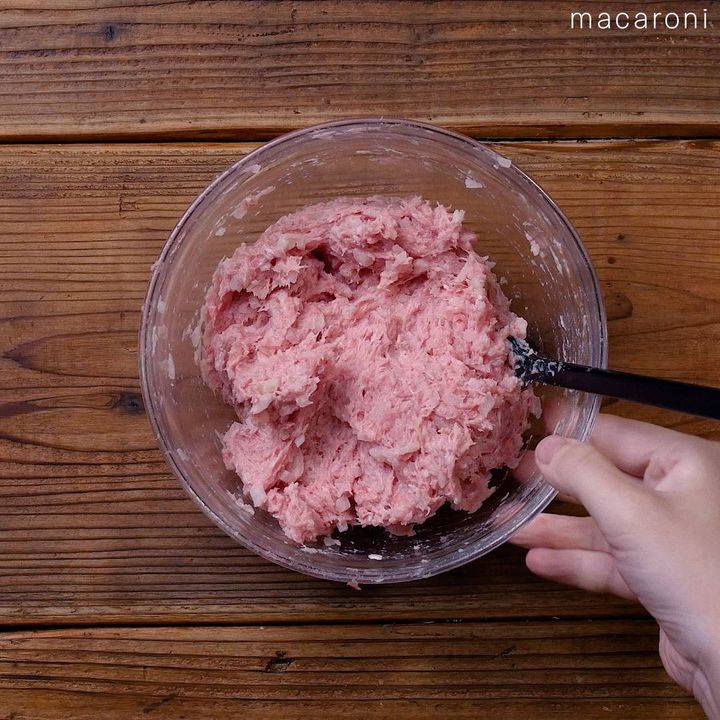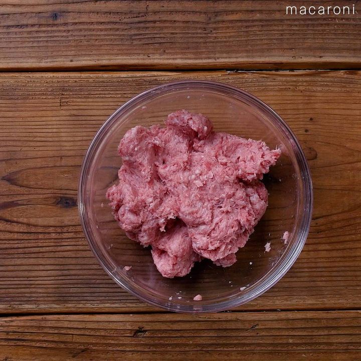 1: ボウルに豚ひき肉、塩を入れて粘り気が出るまでこねます。