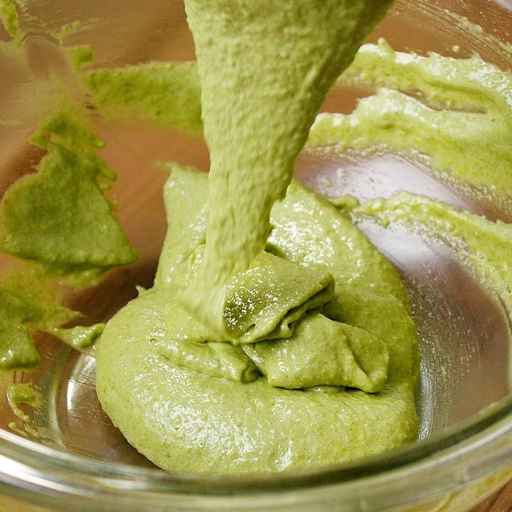 生地にツヤが出て、すくって垂らすとリボン状につながって落ちるくらいになったら手を止めてください。
