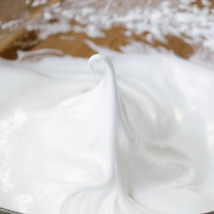1: 卵白にグラニュー糖を2~3回に分けて加えて、その都度よく泡立てます。(※ツヤが出て、ツノが立つまでが目安です。メレンゲがしっかり立っていないと、膨らまなかったり、ピエが出づらくなります。)