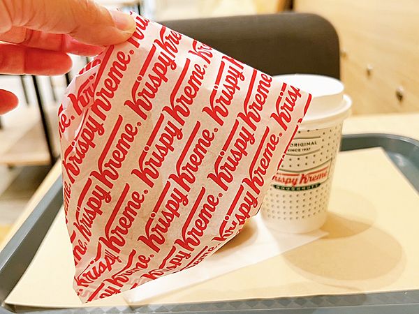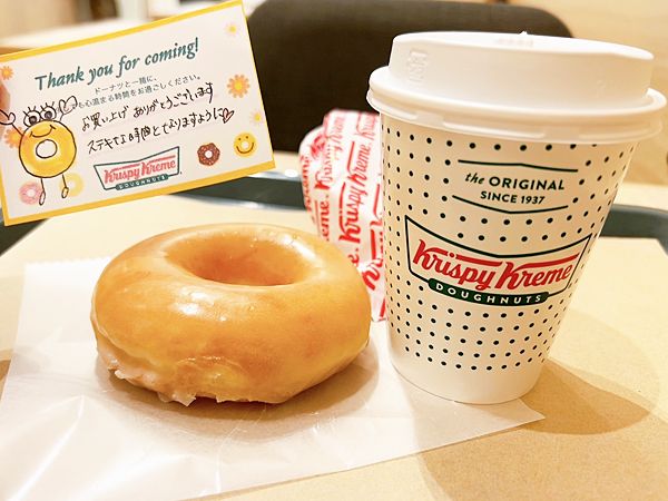 ドーナツ1点以上購入すると、クリスピー・クリーム・ドーナツの人気メニュー「オリジナル・グレーズド」が1個無料というなんとも神がかりなキャンペーン。私はブランチのつもりでコーヒーと「オリジナル・グレーズド」を1個をオーダーしたので、思いがけず「オリジナル・グレーズド」が2個になりました!