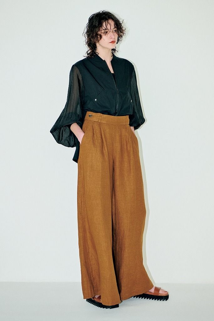 リネンパンツ 20,000円/バナナ・リパブリック シアーブルゾン 64,900円/スタンブリー(ヒューエルミュージアム) 中に着たキャミソール 9,350円/マイカ アンド ディール(MICA & DEAL 恵比寿店) サンダル 35,200円/YOAK(UTS PR)
