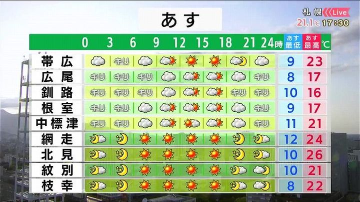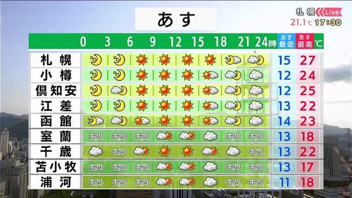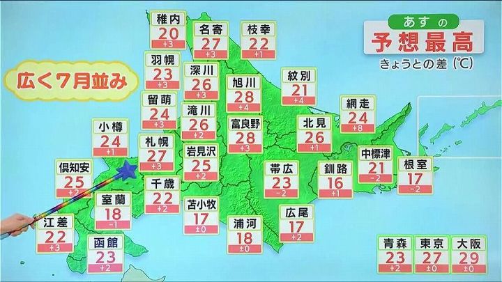 あすはさらに気温が上がりそうです。札幌や、オホーツク海側、内陸の広い範囲で25度以上の夏日となりそうです。