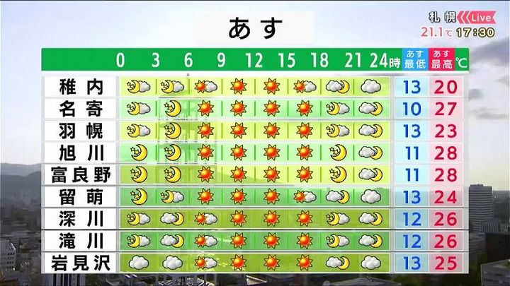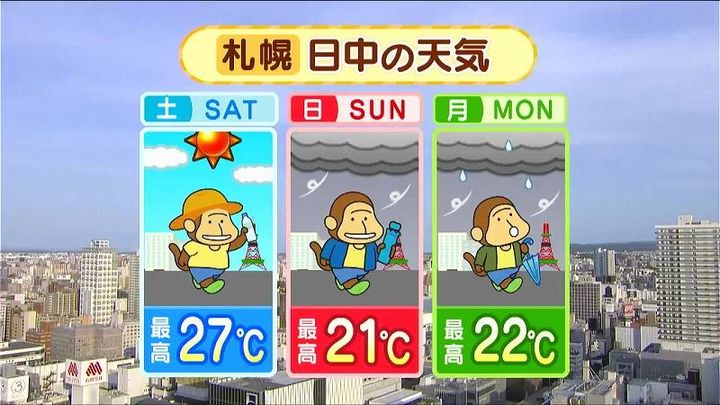 旭川は28度と真夏並み、札幌や北見も7月下旬並みの暑さ30度以上の真夏日になるところも、内陸などであるかもしれません。