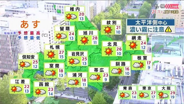 太平洋側では日中でも霧がかかるおそれがあります。オホーツク海側は広く晴れて、網走も25度まで上がる予想です。