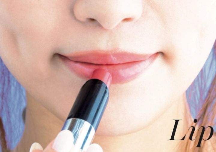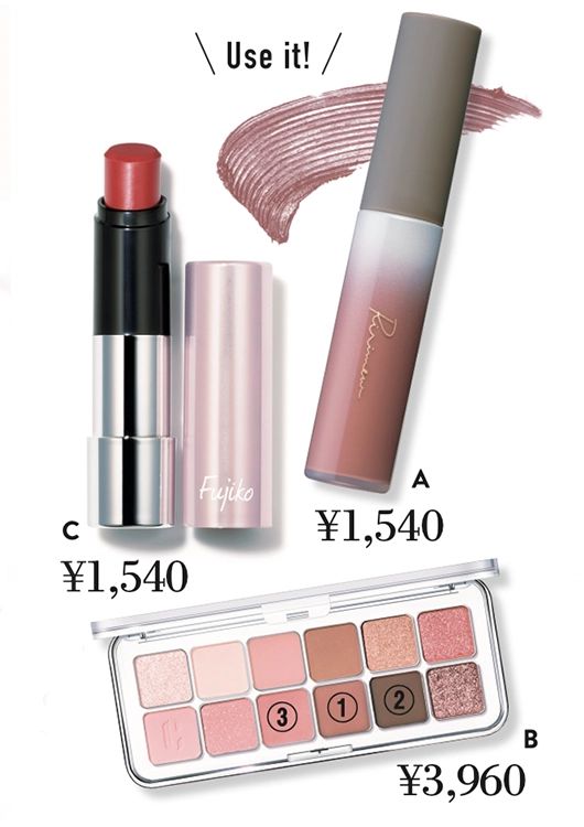 口元は上品で大人っぽいローズ系がおすすめ。ツヤ感を生かすために【C】を唇の形に沿って直塗りして。唇が薄い人は、リップペンシルで輪郭を取ってから塗ると立体感が出て◎。