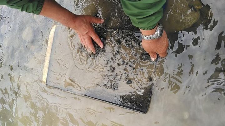 「カッチャ」を使って河原の砂を掘り、「ゆり板」にのせます。