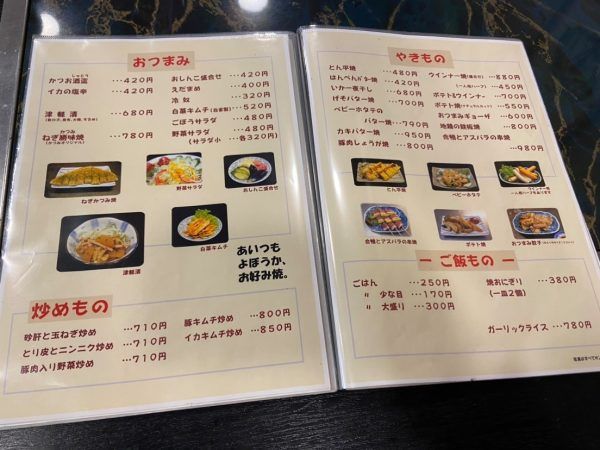 おつまみ・炒め物・やきもの・ご飯もの・お酒類メニューの種類とても豊富でした。平日のお昼前に来店しましたが、満席でした。お友達・ご家族・おひとり等様々な年代の方が来店されていました。