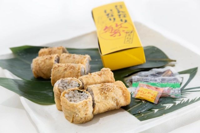 国産大豆を100%使用した「はんなりいなり」は、広げた油揚げに黒蜜を加え海苔を敷き、すり黒ごまをあえた酢飯を巻き上げた、上品な味わいの一口サイズのロール型いなり寿司です。
